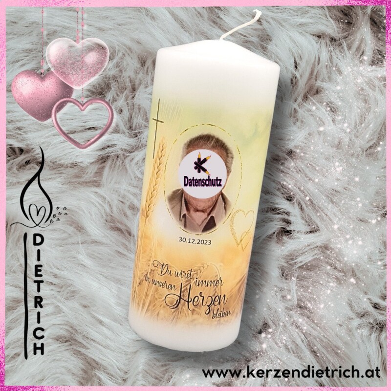 Bei Kerzen mit Foto, bitte dieses - NACH der Bestellung - per Mail (kerzendietrich@speed.at) oder WhatsApp (+4369911636066) schicken. Bitte geben Sie unbedingt Ihren Namen oder die Bestellnummer an, dass das Foto auch der richtigen Bestellung zugeordnet werden kann.